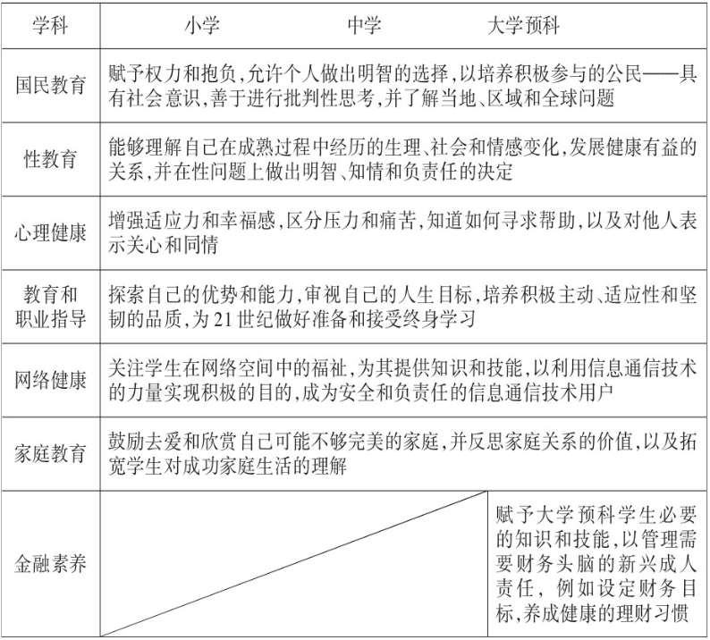 CCE课程在国民教育、性教育、心理健康、教育与职业指导、网络健康、家庭教育这六个相关学科背景下被教授和应用。在大学预科阶段,还增加了对学生金融素养的培育。表1详细介绍了在学科联系背景下对各阶段学生的培养目标。在不同的阶段,对学生有不同的要求。此外,要使CCE课程对学生产生持续的影响,学校环境必须支持学生的性格发展。学校可以通过教职工与学生之间的积极关系建立一个充满关怀的社区。当学生的心理需求得到满足时,学生们会感到与学校有更深的联系,并使自己的学习有更强的主动性、对学校有更强的归属感。同时,学校环境为学生创造学习机会,培养和发展学生的个人性格优势,并使学生具备公民价值观,例如能够欣赏多样性、尊重他人的观点、对共同利益做出承诺等。这些价值观对社会的运作至关重要。一个关怀有利的学校环境,其特点是有关怀和负责任的领导、普遍向上的成长心态、情感和身体安全,以及关注学生、教师和学校社区所有成员的学习和发展。在这样一个丰富的学习环境中,学生可以养成性格和培养公民气质,以及形成健康的社会情感,并感到有能力成为最好的自己。因此,关怀有利的学校环境的必要特征包括一致和连贯的信息传递、积极的师生关系、成人角色榜样、同伴支持和联系、学生的声音和权力。