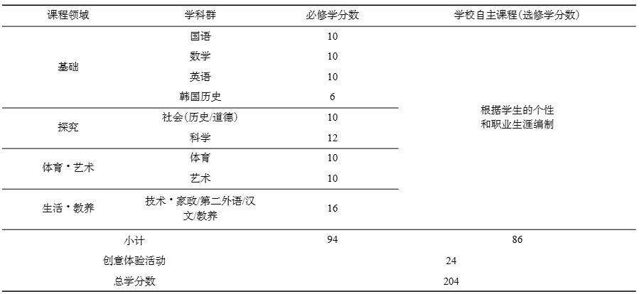 表1韩国小学、初中共同教育课程编制标准